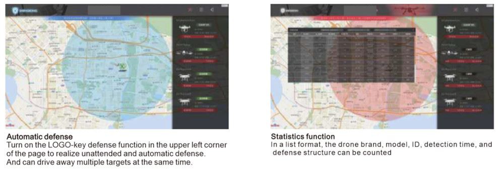 Pentru dronele cu intruziune, puteți alege: Apărare automată cu o singură-cheie: după ce funcția de apărare a sistemului este activată, drona cu intruziune va fi apărată automat de către sistem fără personal de serviciu; Intervenție manuală: puteți alege manual să apărați orice dronă și cum să apărați în timp, sau să întrerupeți apărarea și puteți alege să localizați pilotul.